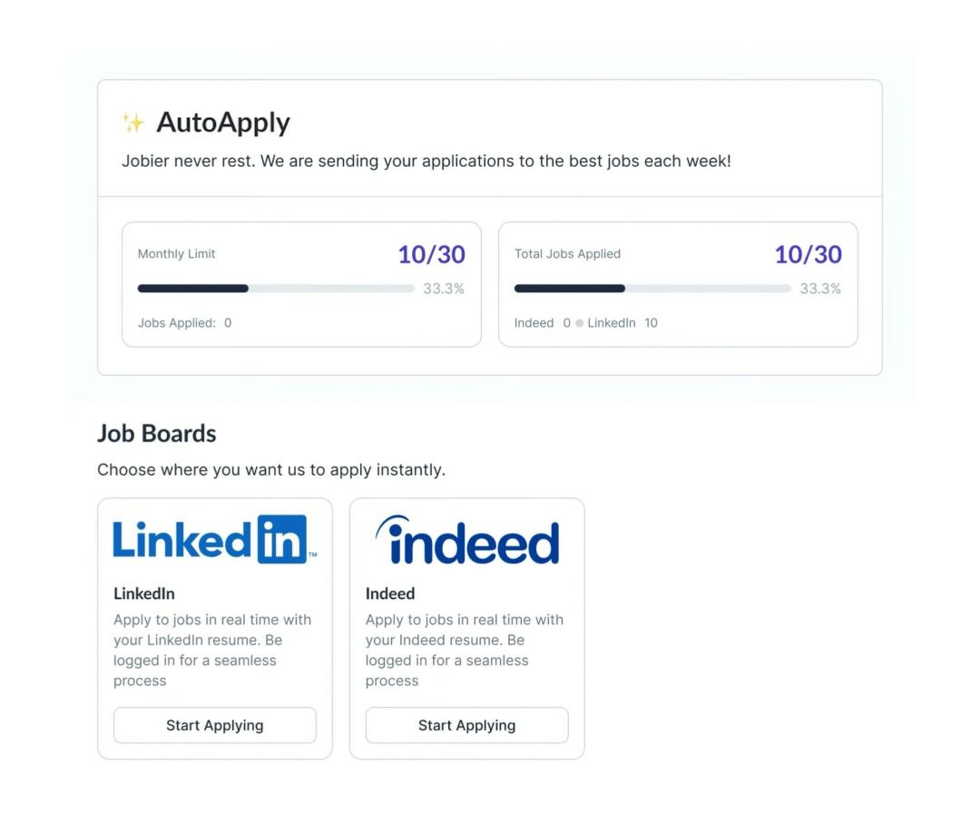 All you need to do is upload your resume or LinkedIn profile, and Jobier will take care of the rest, from matching you with suitable jobs to streamlining your applications all for free!