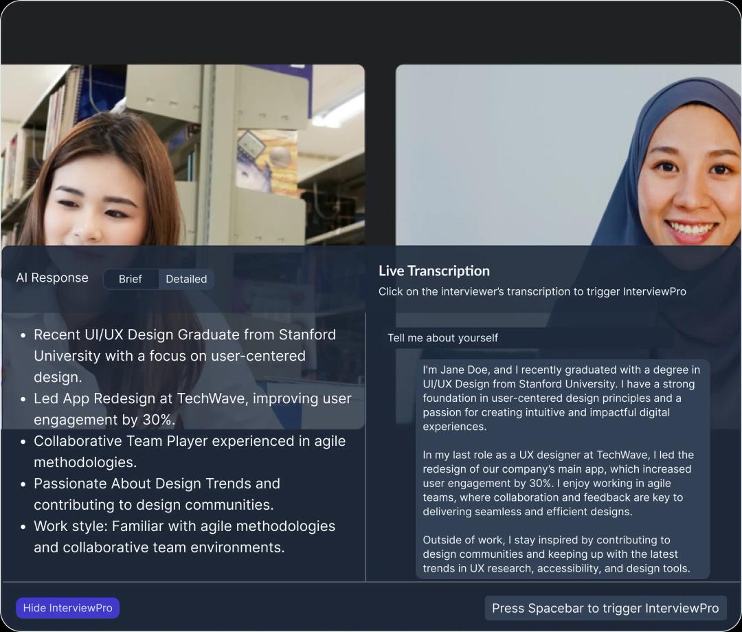 Enhance your performance with real-time support and insightful feedback, ensuring you’re ready for any interview.