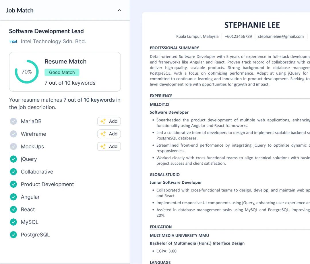 Gain insight into which aspects of your experience and skills stand out, helping you optimize your resume to align with job requirements and attract recruiters.